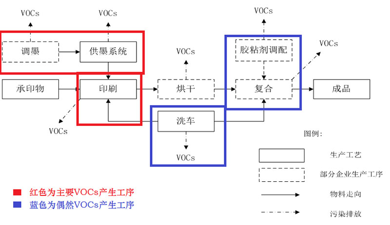 1、该套设备主要用于客户的彩印生产线废气处理。VOCs的主要产生工序如下图: