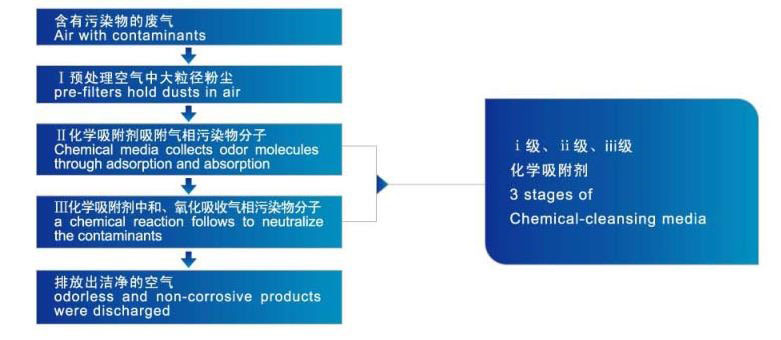 化学过滤器,以常温常压下,干式化学吸附与化学吸收氧化为核心技术,采用多级物理过滤联合多级化学氧化吸收,首先预处理空气中的粉尘,再通过不同性能的化学吸附剂多级联合,有选择性的将空气中的气态污染物质吸附到吸附剂孔隙中,继而与负载于吸附剂中的活性物质发生常温、持续、而且不可逆的化学吸收和氧化反应,气态污染物质被不间断地中和、分解、氧化为无机盐、H2O、CO2等无害物质,释放出洁净的空气。